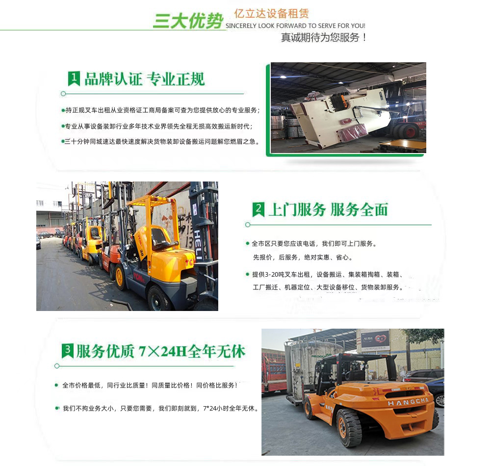 亿立达设备租赁有限公司是工商局准许的北京农学院专业叉车出租公司,公司本着诚信、服务、效率、创新的经营理念,用精湛的技术,真诚的服务,为众多客户提供优质的服务,同时获得信赖与支持。专业提供北京农学院3-20吨叉车出租、叉车租赁、设备搬运、集装箱掏箱装箱、机器移位定位、货物装卸、工厂搬迁、安全可靠,收费透明,价格便宜,随叫随到,24小时上门服务!本公司叉车吊车师傅对各种设备搬运装卸都有深刻探讨和研究。很多的疑难设备搬运,通过我公司的叉车师傅都能迎刃而解。对各种进口设备、国产机器、大型设备搬迁、高难度搬迁、各种精密仪器、医疗设备、科研设备等都能搬运; 提供全市 24 小时上门装卸搬运服务。同时提供厂房搬迁服务。 ...
